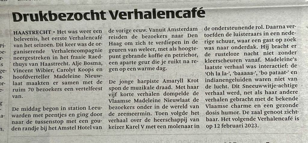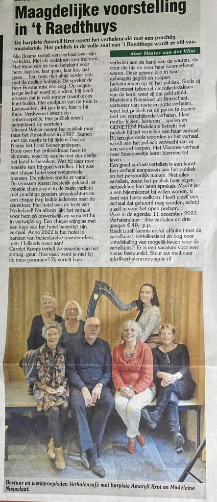 Het eerste Verhalencafé van het seizoen 2022/2023 op 23 oktober 2022 was met circa 70 bezoekers een druk bezocht Verhalencafé. Voor het eerst ook bij ’t Raedthuys. Hester van de Vlist was erbij en schreef er over in de IJsselbode.