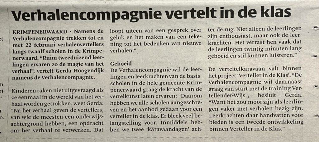 In januari en februari 2023 trok er een vertelkaravaan langs 12 basisscholen in de gemeente Krimpenerwaard. Meer dan 2000 kinderen en 100 leerkrachten genoten van de verhalen. Maar voor de vertellers zelf was het ook een feestje. De reacties die ze krijgen waren hartverwarmend. Het kan dus echt: kinderen boeien zonder Ipad, zonder snelle toeters en bellen Een verhalenverteller weet hoe.