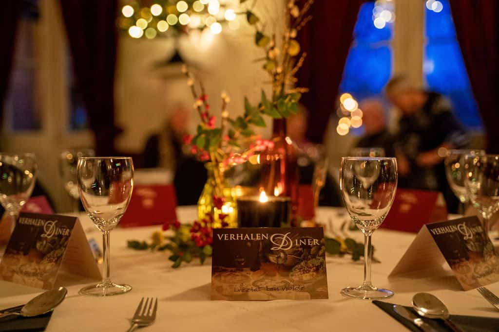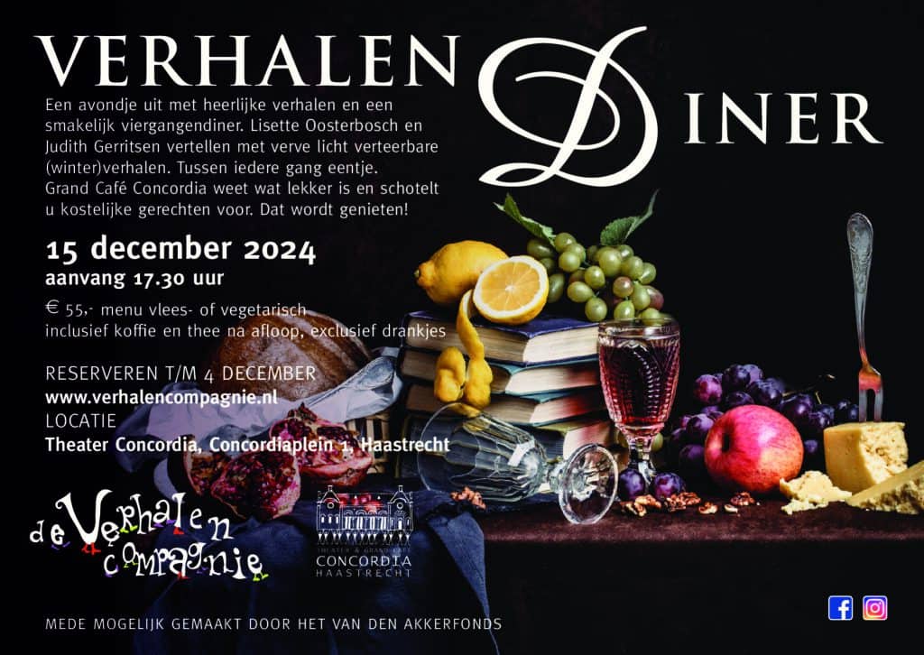 Stel je voor: prachtig gedekte tafels met brandende kaarsen, glanzende kerstversieringen, fonkelende glazen gevuld met wijn, een vier menugangen en tussen de gangen door licht verteerbare verhalen. Op 15 december a.s. staat het tweede Verhalendiner op stapel. Het Verhalendiner is een samenwerking tussen de Verhalencompagnie en Grand Café Concordia.