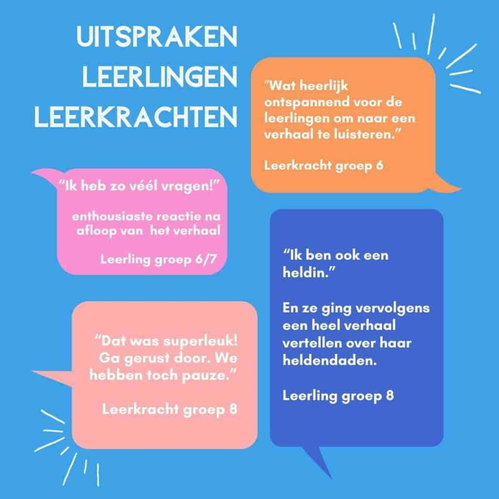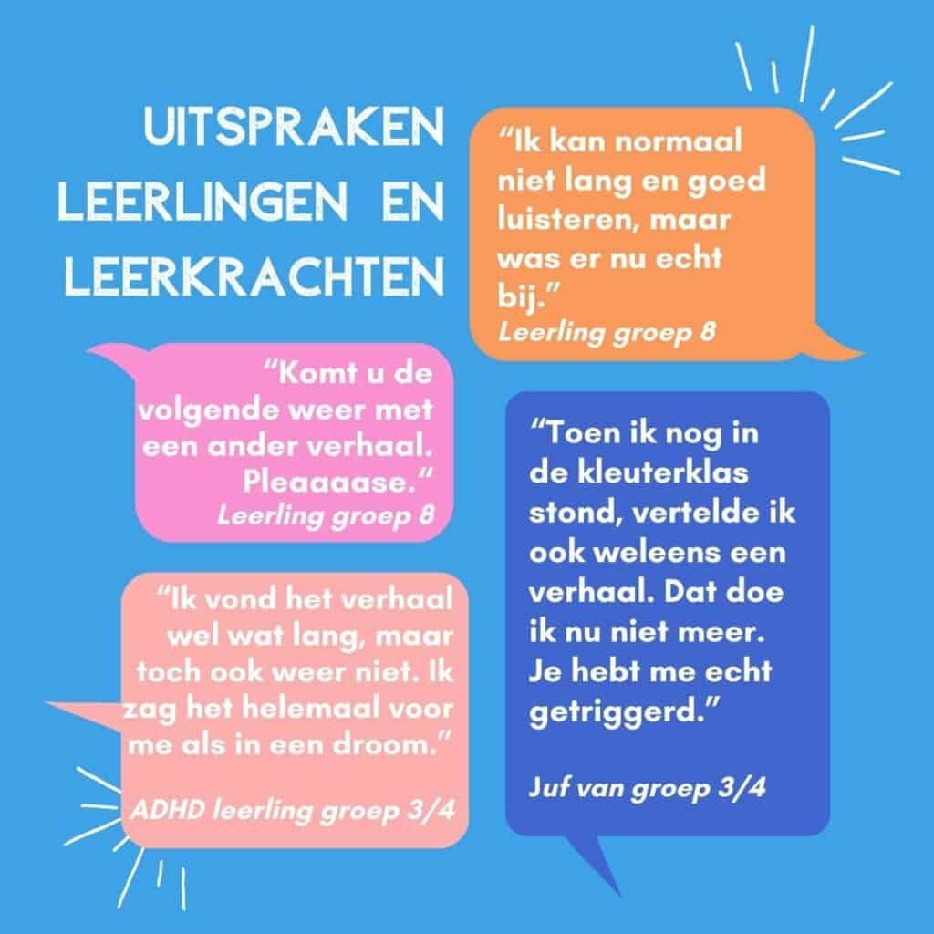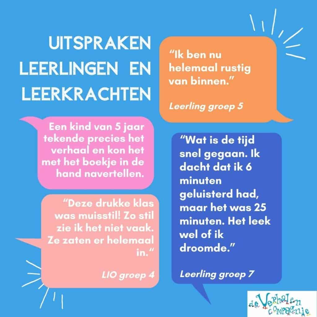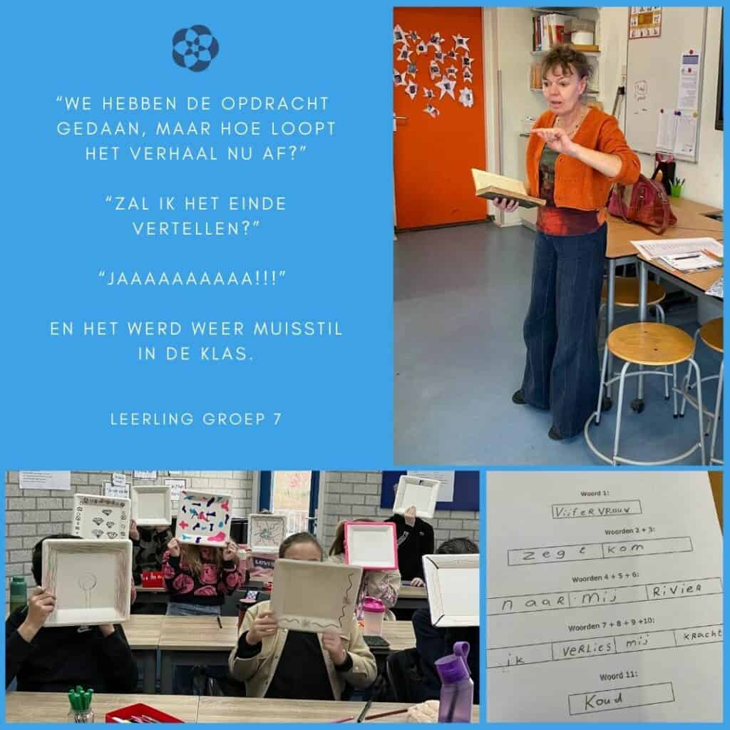 Je kunt kinderen enorm boeien met een goed verhaal. Ze kunnen er ademloos naar luisteren en zich helemaal verplaatsen naar de wereld van het verhaal. Hun verbeeldingskracht wordt flink aan het werk gezet, want al luisterend maken zij plaatjes in hun hoofd, leren ze nieuwe woorden en contekst, leren ze zich te verplaatsen in anderen en oefenen ze in concentreren. Kortom, luisteren naar verhalen is plezier en leren tegelijk. En dan nog een aspect, verwoord door een leerkracht van groep 6: “Wat ontspannend voor de kinderen om naar een verhaal te luisteren.”