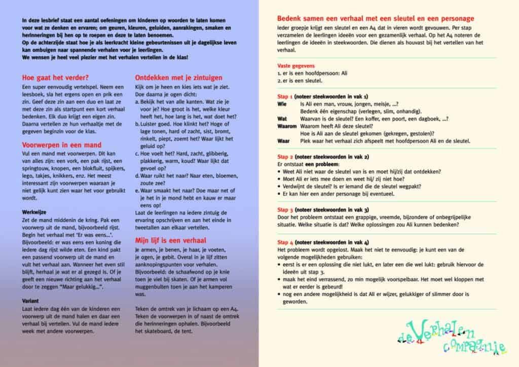 Het is niet alleen waardevol dat kinderen luisteren naar de prachtig vertelde verhalen, maar we vinden het ook belangrijk dat ze actief aan de slag gaan met de verhalen. Daarom heeft de Verhalencompagnie meerdere lesbrieven ontwikkeld. Hierin staan praktische tips waarmee leerkrachten kunnen voortborduren op het verhaal dat door de vertellers in de klas verteld is. De lesbrief “Fantasie is een spier die je kunt trainen” gaat over kinderen leren zich uit te drukken over wat ze denken en ervaren: geuren, kleuren, aanrakingen, geluiden, enz. Deze lesbrief is gerealiseerd met financiële hulp van Streekfonds Krimpenerwaard.